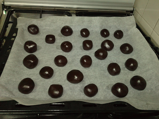 Com as mãos faça pequenas bolas e coloque no tabuleiro do forno já forrado com papel vegetal.