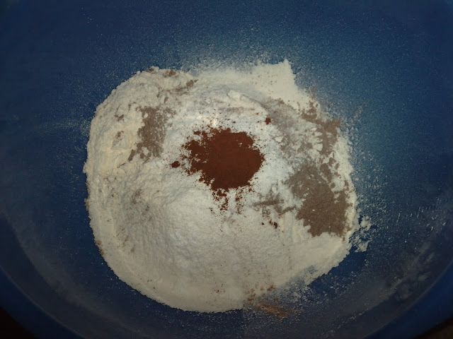 Numa bacia aparte coloque a farinha peneirada, se não tiver uma peneira para a farinha, pode utilizar um coador para a peneirar. Depois junte o cacau, o fermento e a canela, misture tudo muito bem e junte ao creme de chocolate.